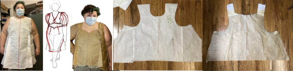 The lines for the midriff band have been added. The back (which will have a zipper) repeats the piecing of the front (professionals scorn plain backs as “coffin clothes”).