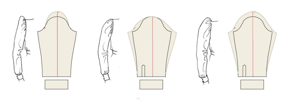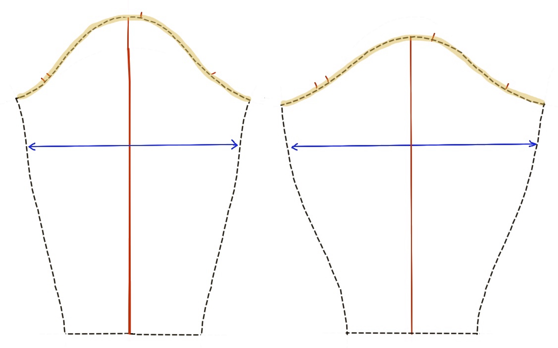 An average sleeve and one with a wider biceps circumference (blue) for comparison. The length of the armscye (gold) must not change so that it fits the same bodice.