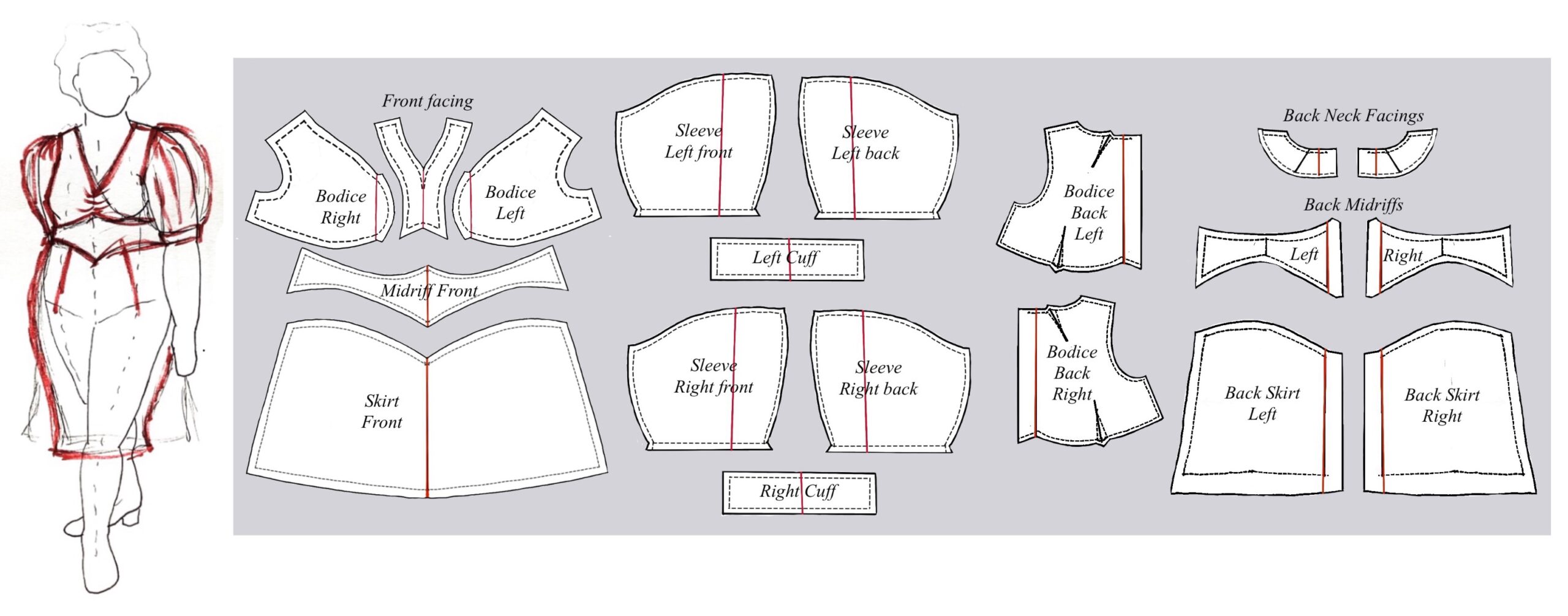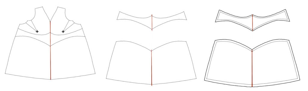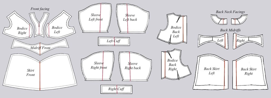 Trace off the front midriff band and skirt pieces. Pin-track/reconcile/true the sewing lines (be sure they’re the same length) and add seam allowances. Label every piece as you finish it!