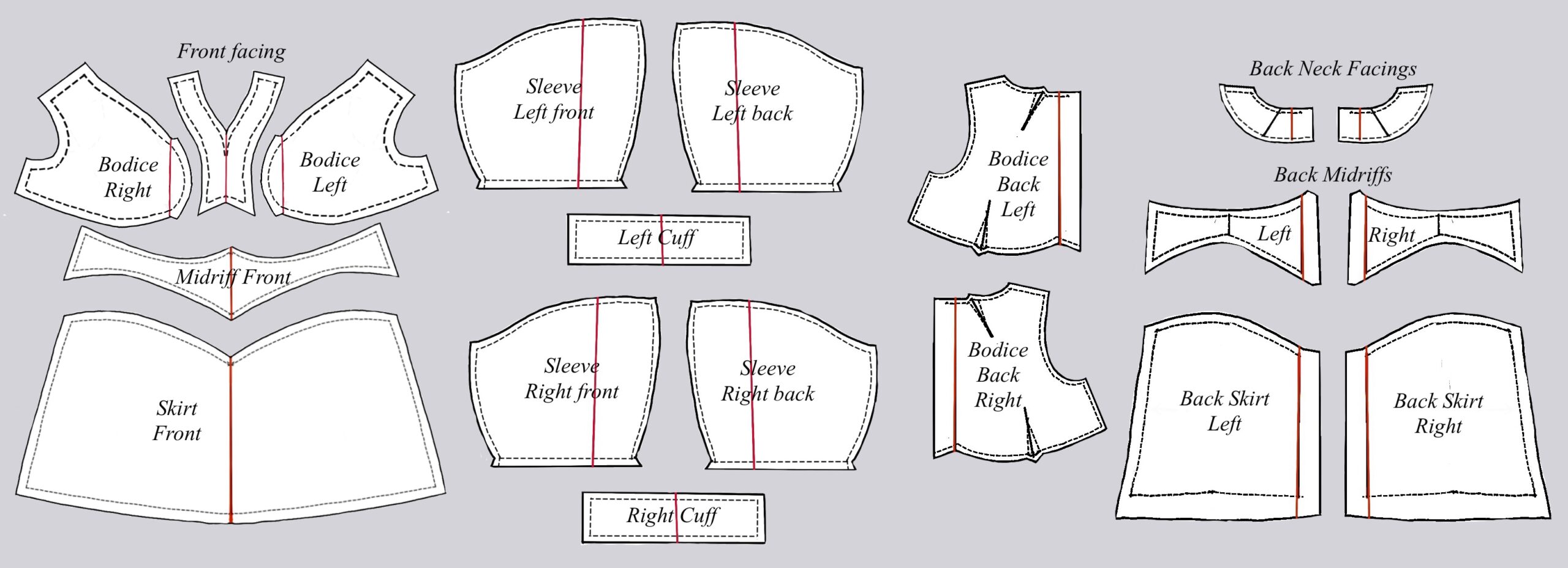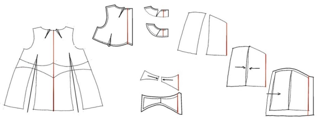 Reconcile the lengths of the seam lines with the previous pieces as you go. When the cutting lines (solid) are drawn, add the zipper allowance at center back and the turn-up for the hem.