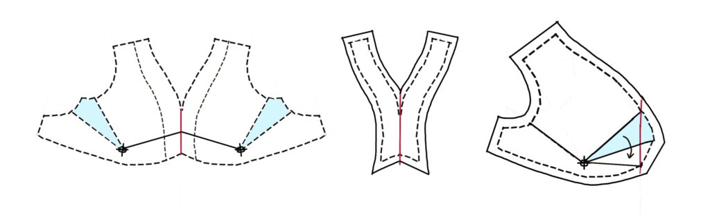 Split the pattern at center front and shift the armscye dart to gathers there. They can be fuller than the dart they replace: the blue is the shifted dart and the white wedge is the extra. Refer to your fabric tests to see what you think is suitable. The front is supposed to bulge out; if you make it a straight line there won’t be enough fabric.