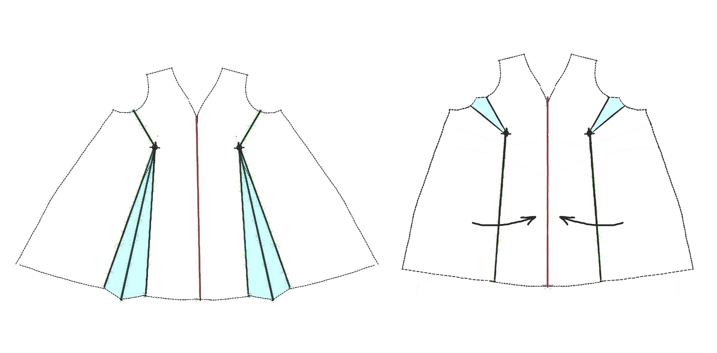Use dart manipulation to move the dart take-up from the lower skirt to the armscye, pivoting at the “bust apex” (nipple).