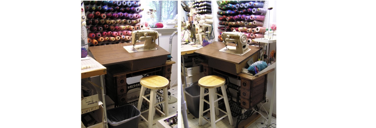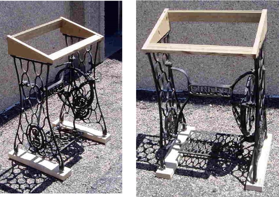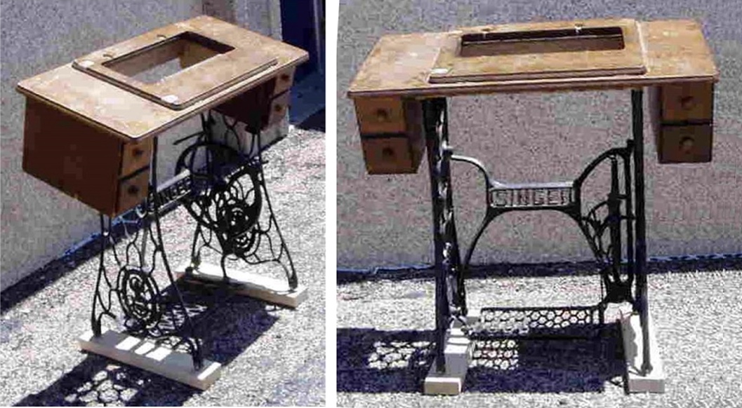 Years previously, I had found a set of irons on a visit back to Nebraska. After copious applications of Naval Jelly and elbow grease, they worked fine. Their cabinet had likewise been kicking around for years but was sound. The head was a Singer 411G, which I had found on a Canadian website and had converted from electric back to treadle.