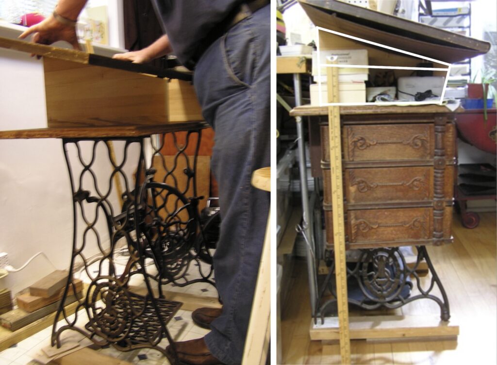 We decided it would be better to seat the cabinet squarely on the irons (as originally done) and add a box to get to the right height. It would include a folding top/bed cannibalized from a machine in Courtney’s stash.