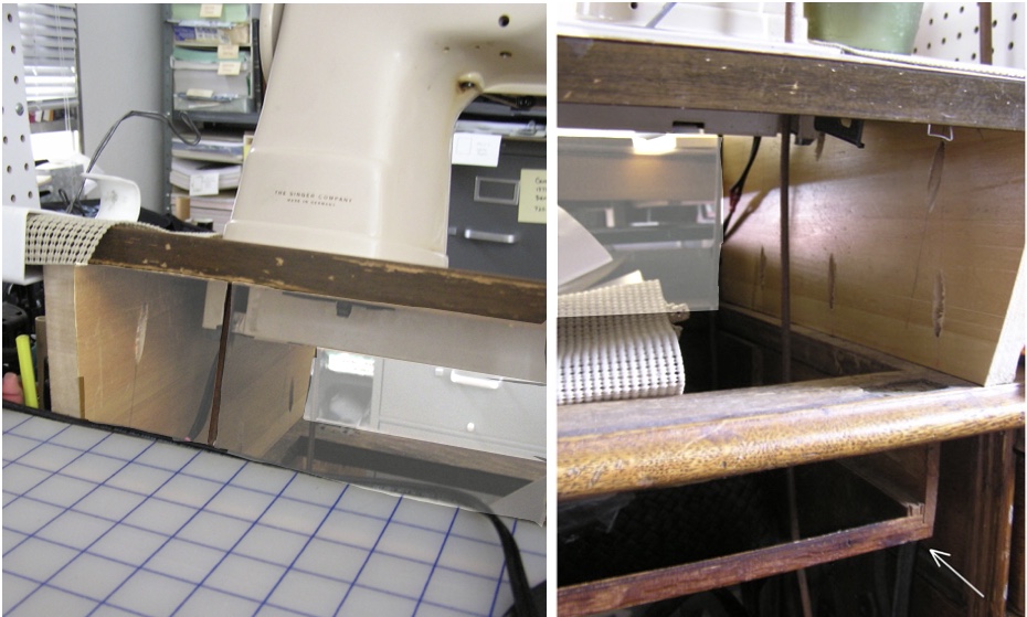 The treadle belt viewed from the back and the front. The machine head was cheated as far to the right side as possible (without the belt touching the sides of the cabinet or the irons) to center the needle bar in front of the person sewing.