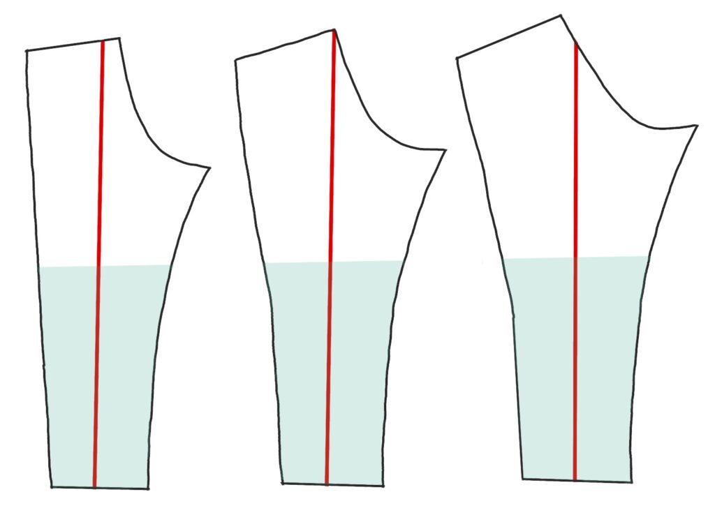 The grainline runs vertically up the leg from the ankle to above the knee. It continues straight up through the pelvic area, which tips back as the hip area gets fuller. We will adjust the position of the grainline in the first muslin, when we see where it falls in the fabric on the body. If it isn’t vertical, the legs will twist.