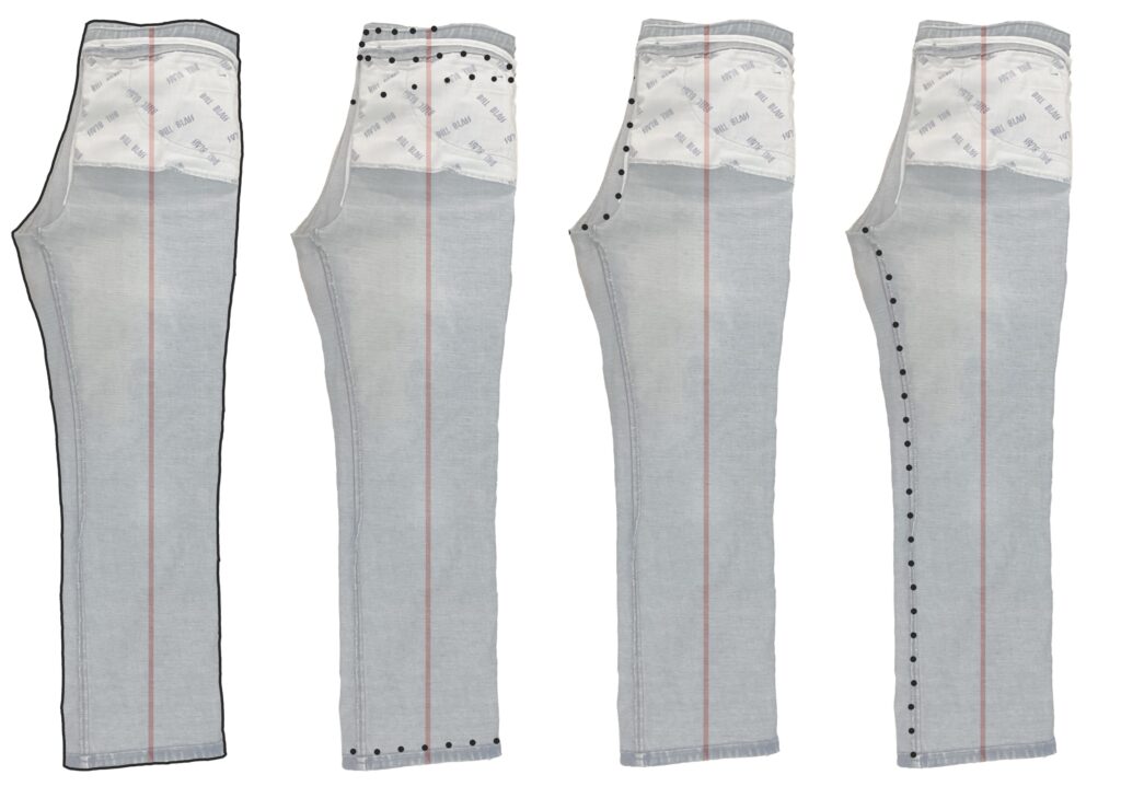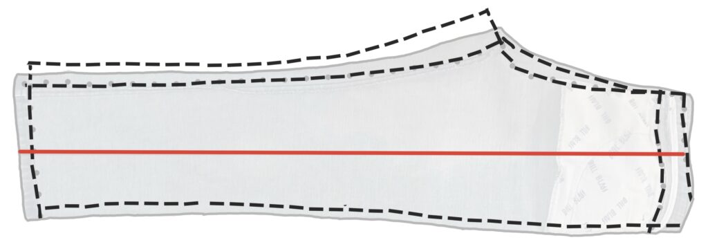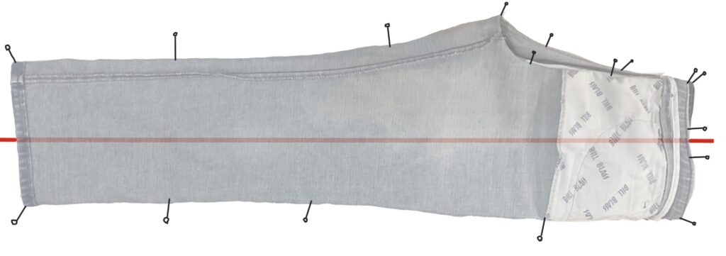 Reconcile (true/pin-track/justify) the inseam and outseam – check that the sewing lines are the same length.
