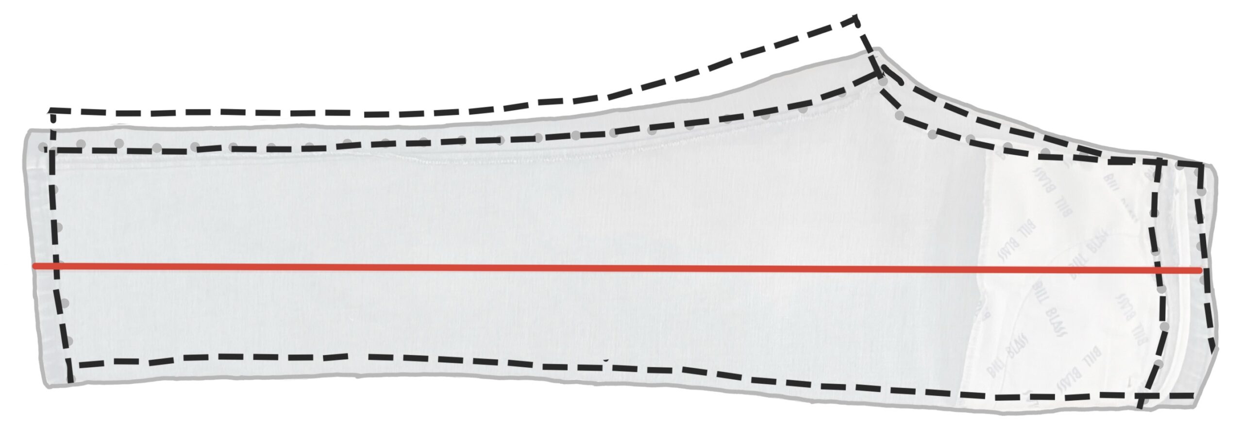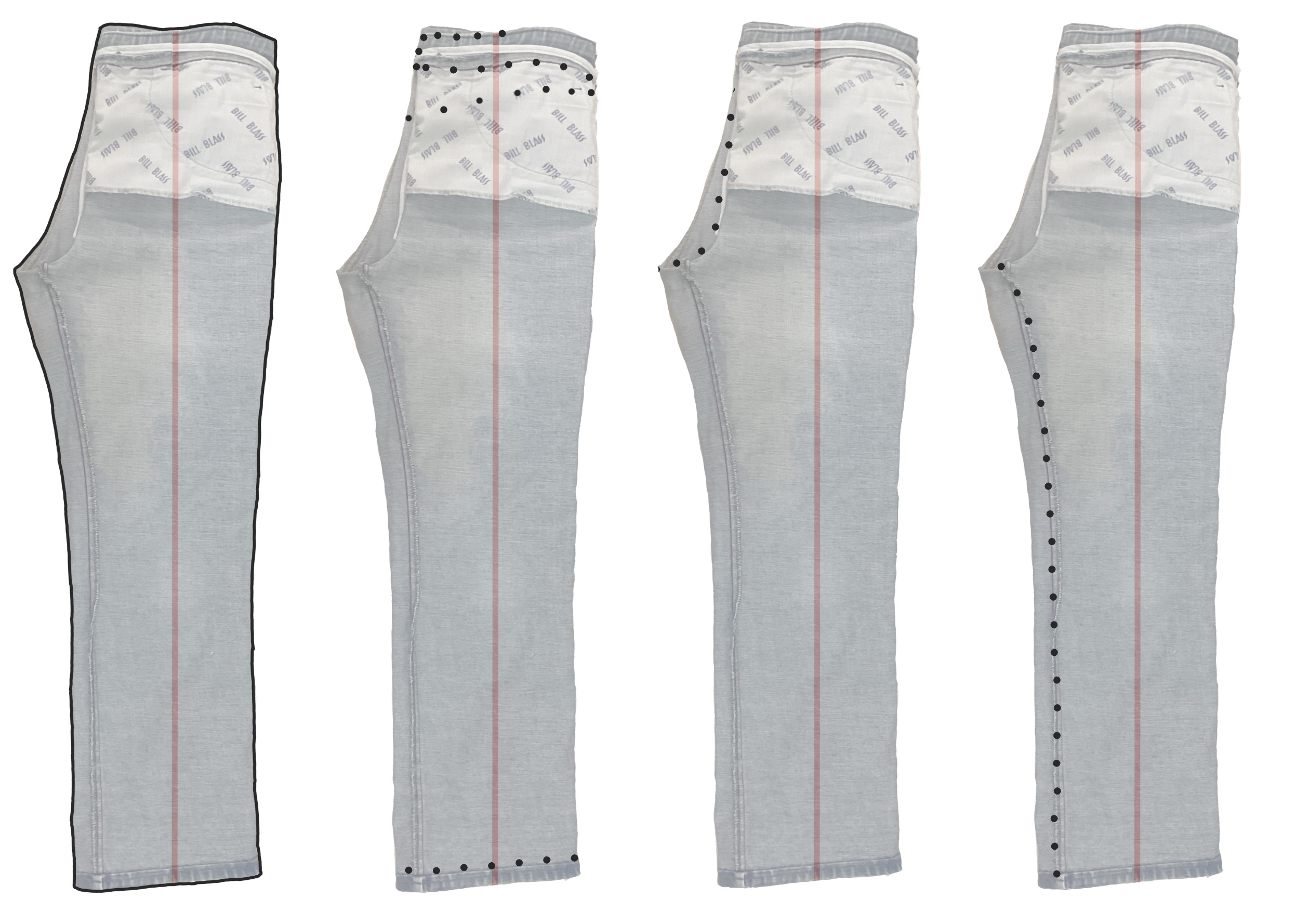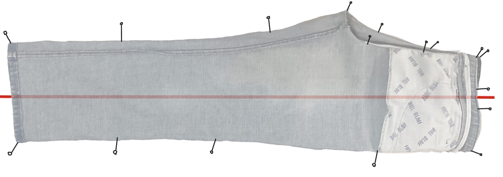 Lay a large sheet of paper with a vertical red grainline on your work surface, then your pants with the fronts uppermost and the outseam at one edge. Smooth out as far as possible.