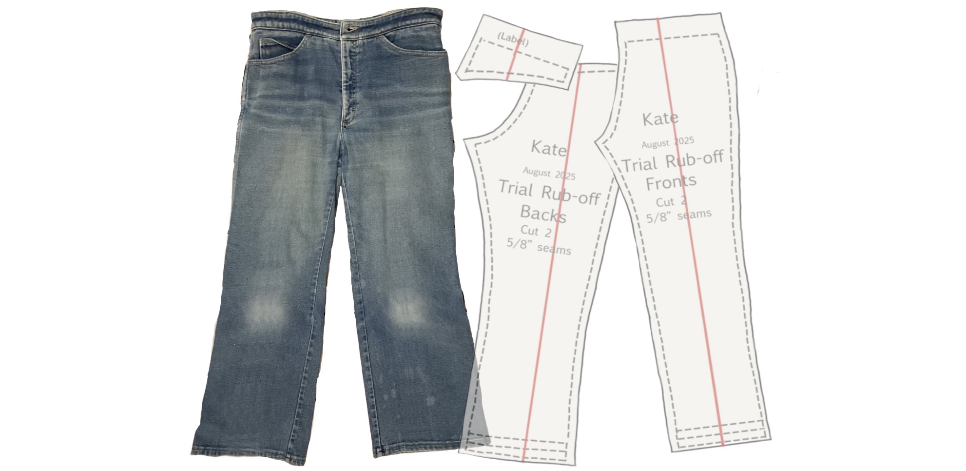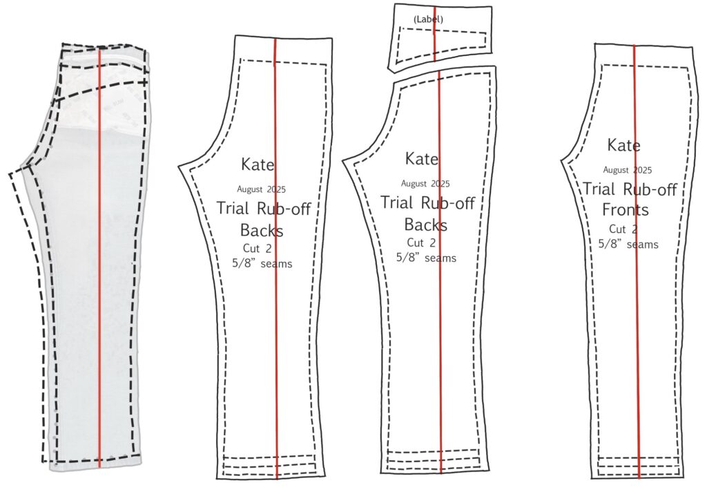 Label the pieces with name, date, pattern piece, and description (such as “Trial Rub-Off”).