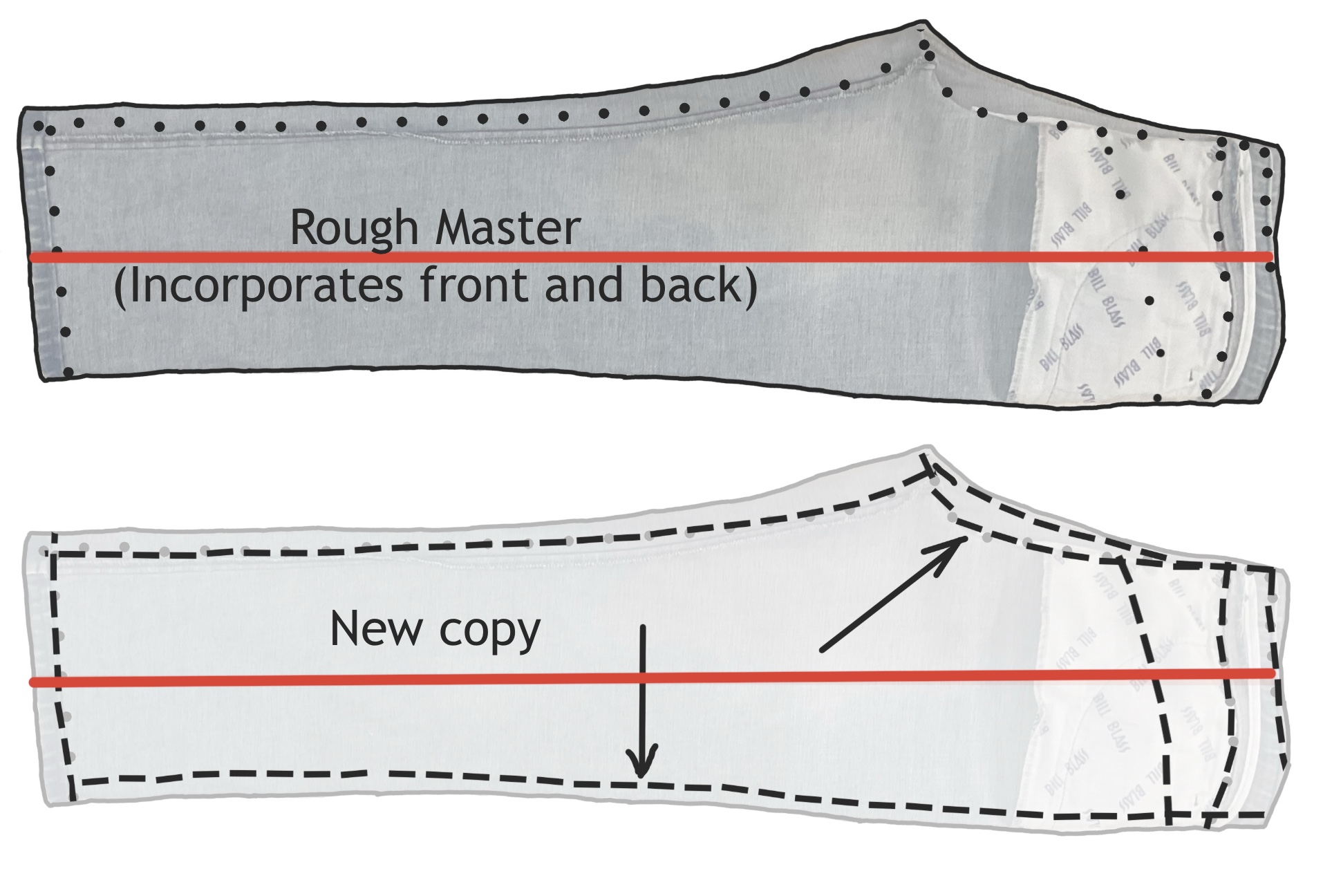 Create a new pattern by copying these pieces exactly and then incorporating the changes you want. Altered masters: “sleeve length should be 1/2”/1 cm longer” “drop front neckline xx amount” “widen shoulder strap to xx”