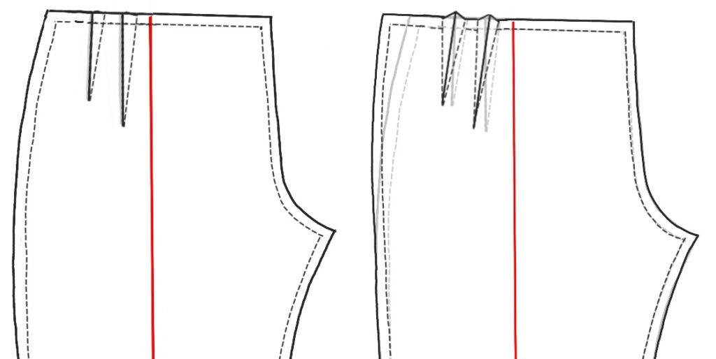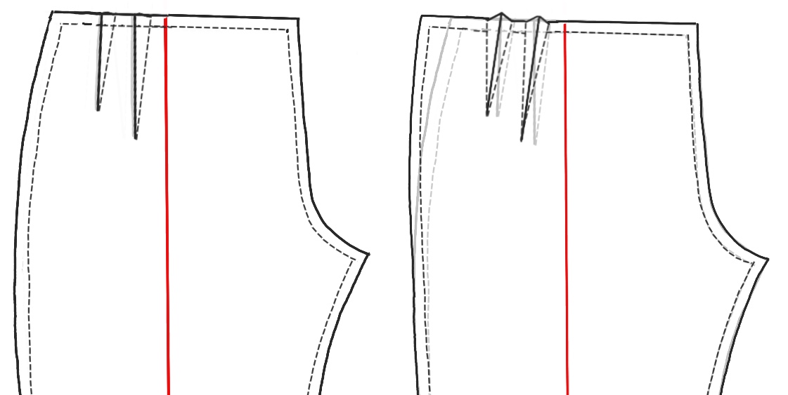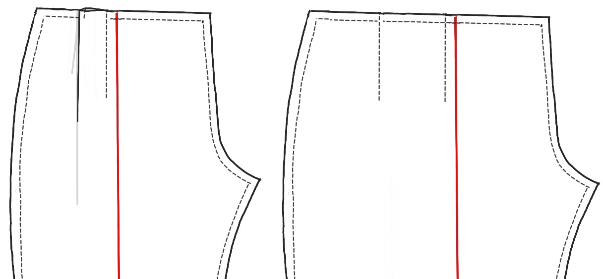 Rubbing off the creases isn’t hard, but figuring out how to open them up and move over the pattern’s outseam can seem baffling. Essentially, add the width(s) of the opened darts to the waist at the outseam, and redraw the top of the outseam to rejoin the side at the darts’ length. Give it your best shot. Anywhere close will be corrected in your first muslin. Dart legs can be vertical or slant. Again, we’ll correct in the muslin.