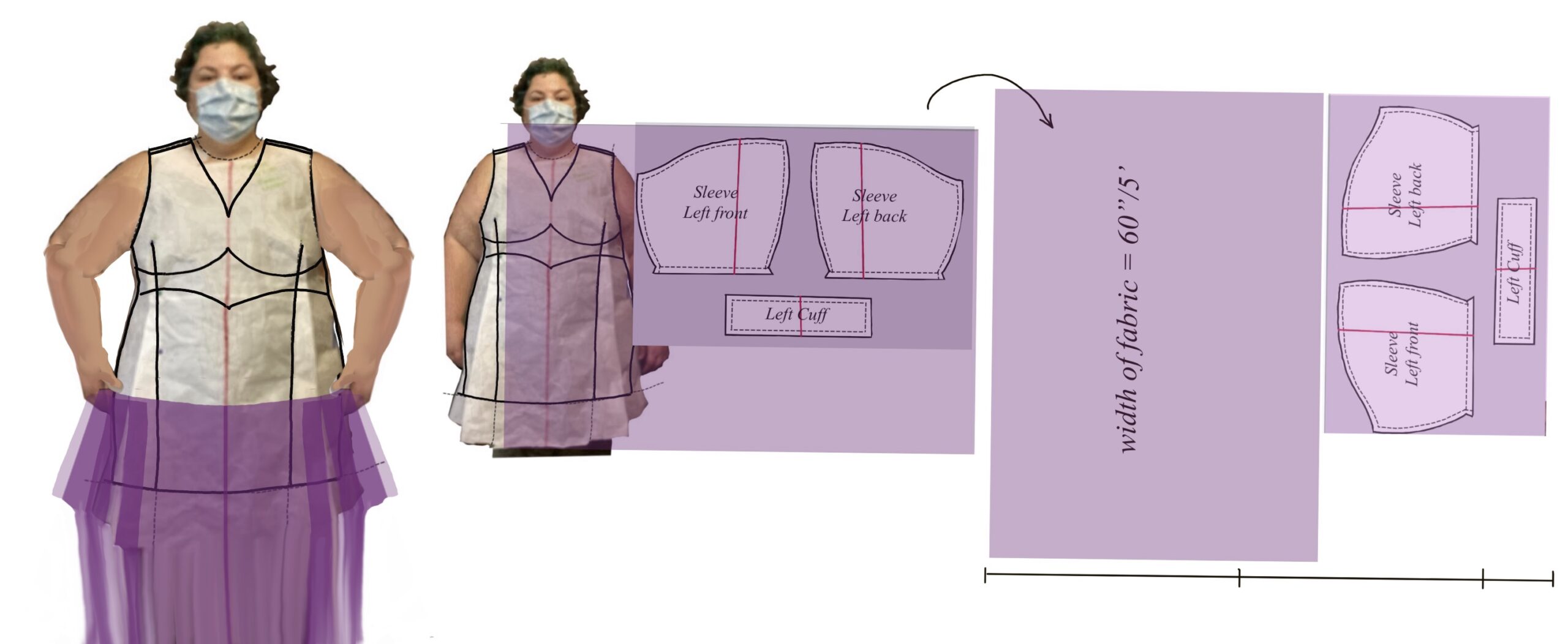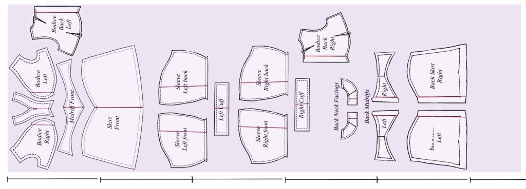 Here’s an actual loose layout using a single-layer, directional format (if the fabric is folded, same amount). We can see it could be tightened up enough to get out of five yards and still have enough extra for shrinkage.