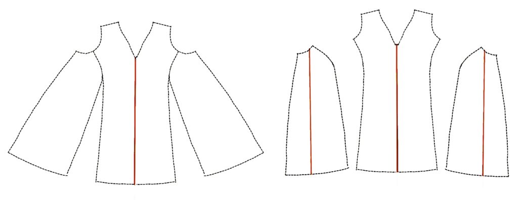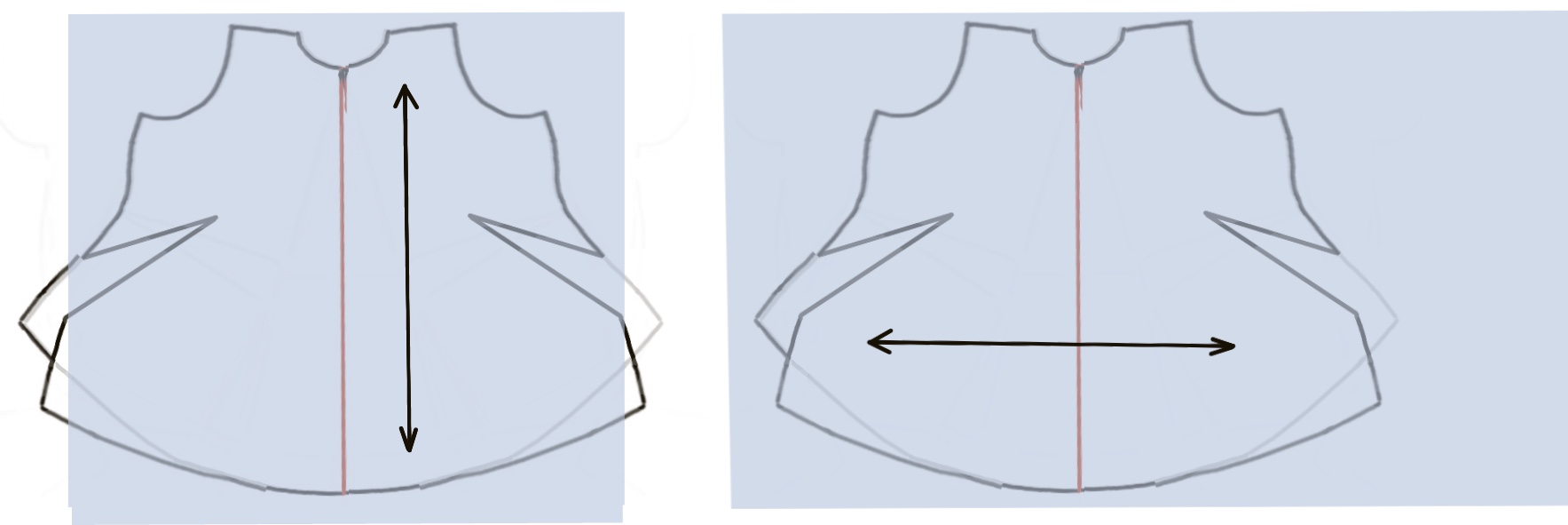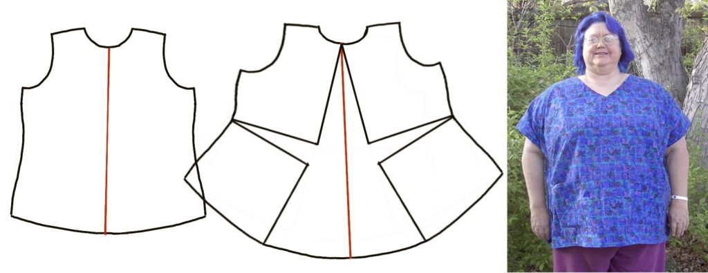 Modifying a top for a larger body without changing the shoulder width. The sides pivot out from the top of the armscye, and the body is slashed and spread for the fullness needed.