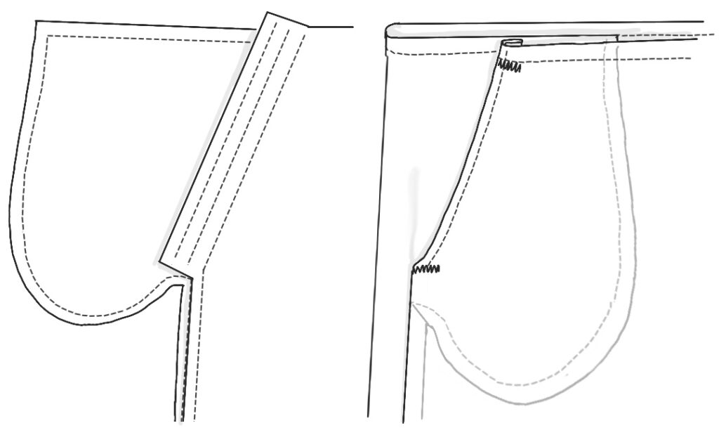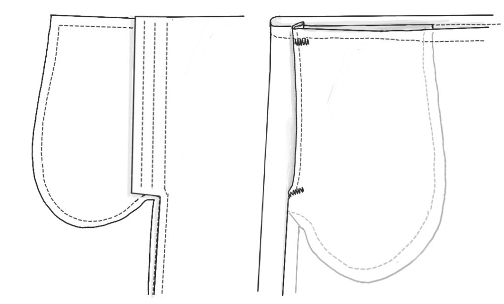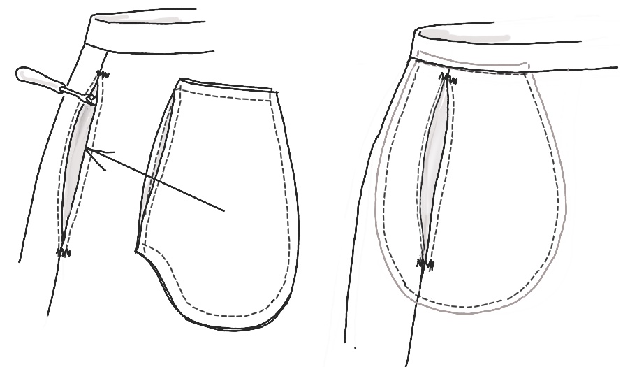 Here’s the traditional pattern for pants (or a skirt) with side-seam pockets. If the pockets are teardrop-shaped and the garment has a seam at the waist, extend the top of the pocket to be caught in that.