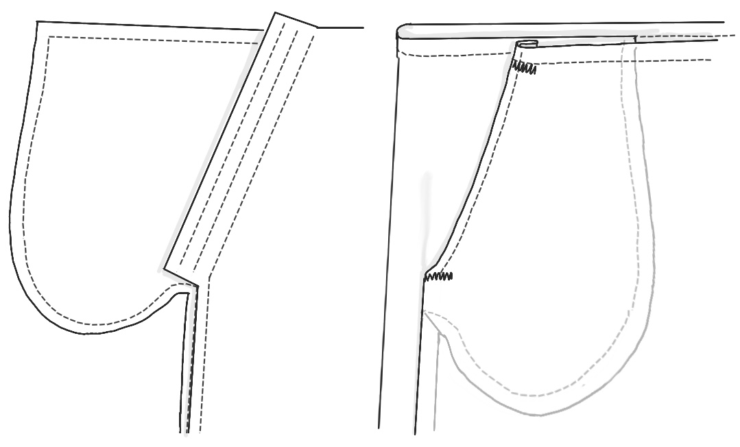 Left: the traditional bag, right: the inside patch. The back of the pocket is cheated back from the opening to reduce bulk at the side seam and make it easier to sew. You can shape your pockets any way you want.