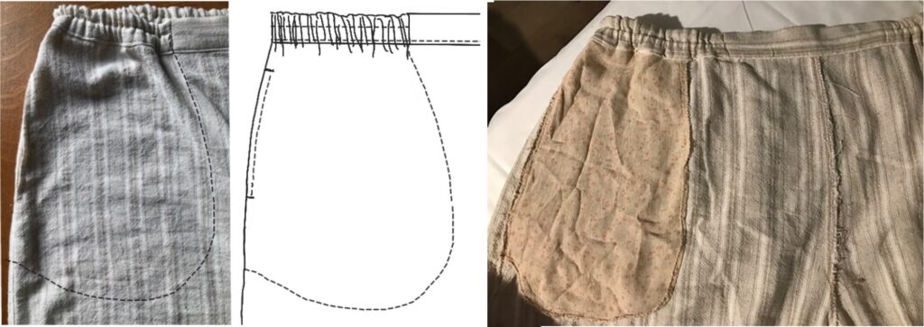 It’s vaguely trapezoidal, with curved sides, with the patch sewn to the inside and accessed through an open section of the side seam (it could be used instead of the inseam one below on pants or a skirt). I’d move it towards the front rather than center it, and catch the top in the waistband seam. It won’t hold much, but if all you need is a tissue and card or two, it would be fine.