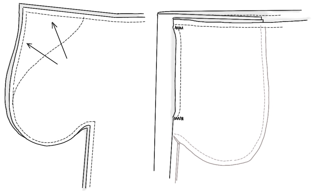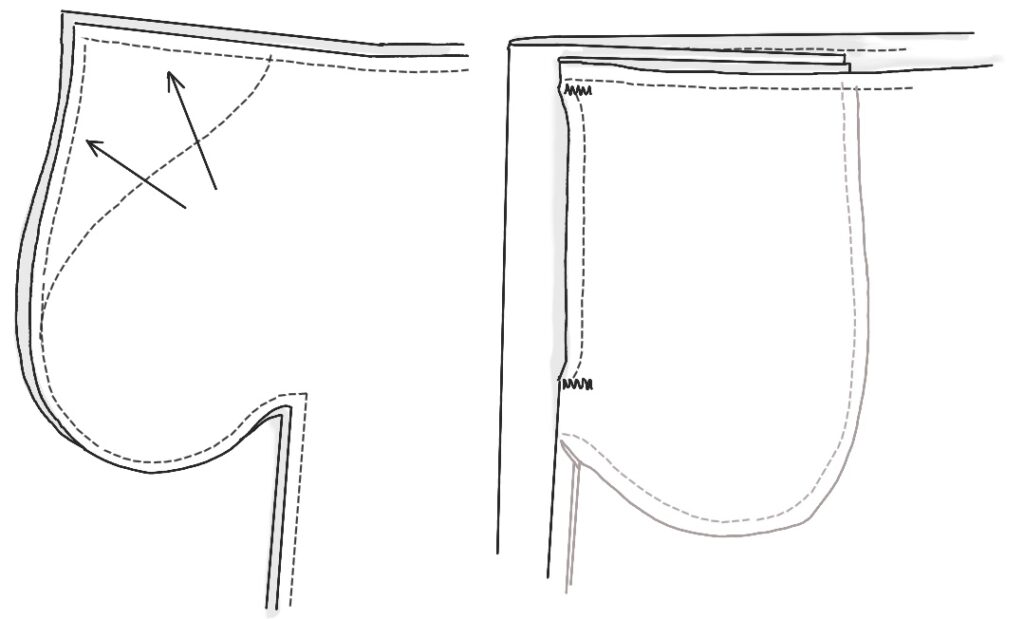 This came from a lively discussion on Ravelry’s Team-Sew-My-Wardrobe thread, which began with the problems of a pocket cut onto the front and back of pants (or a skirt or top) with its bag turned to the inside.