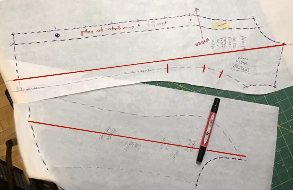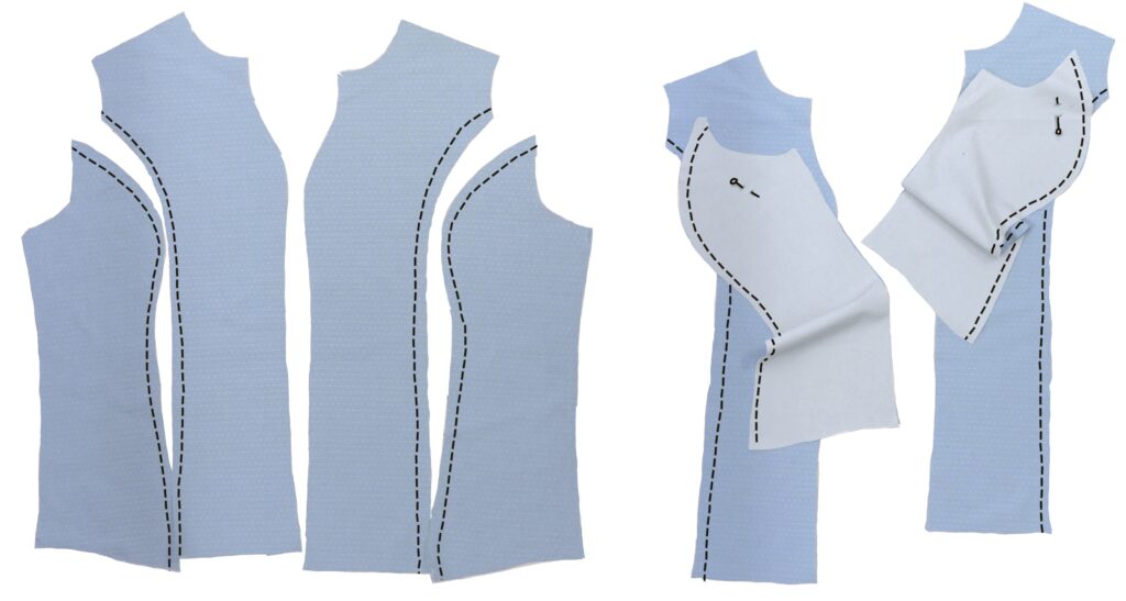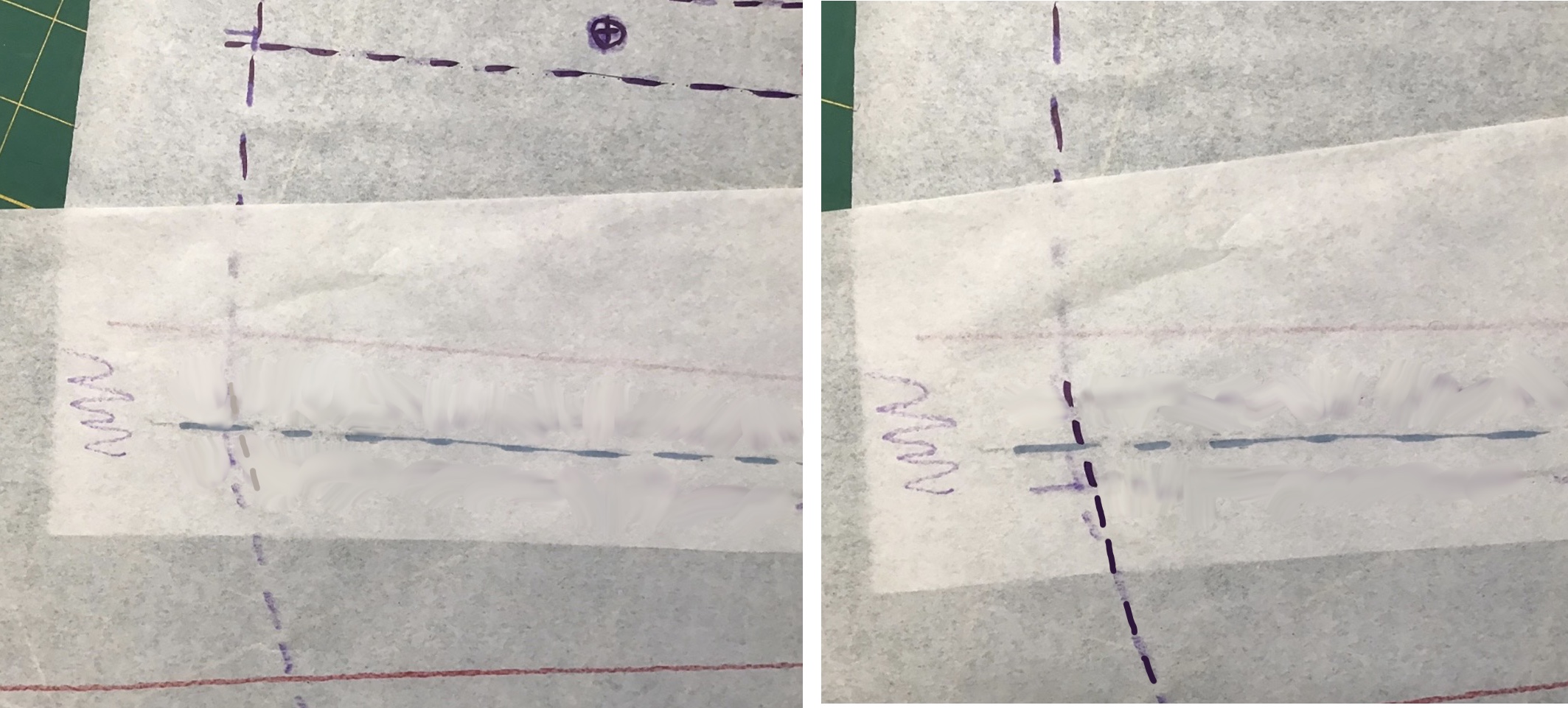 Reconcile the side front to the center front along the side front seam (the princess). Begin by tracing both pieces. Add three cross marks on the side front seam of the front piece: one at the fullest part of the bust (hold it up to the body if you’re not sure where this is), one about a third closer to the underarm, and the third about twice that much lower.