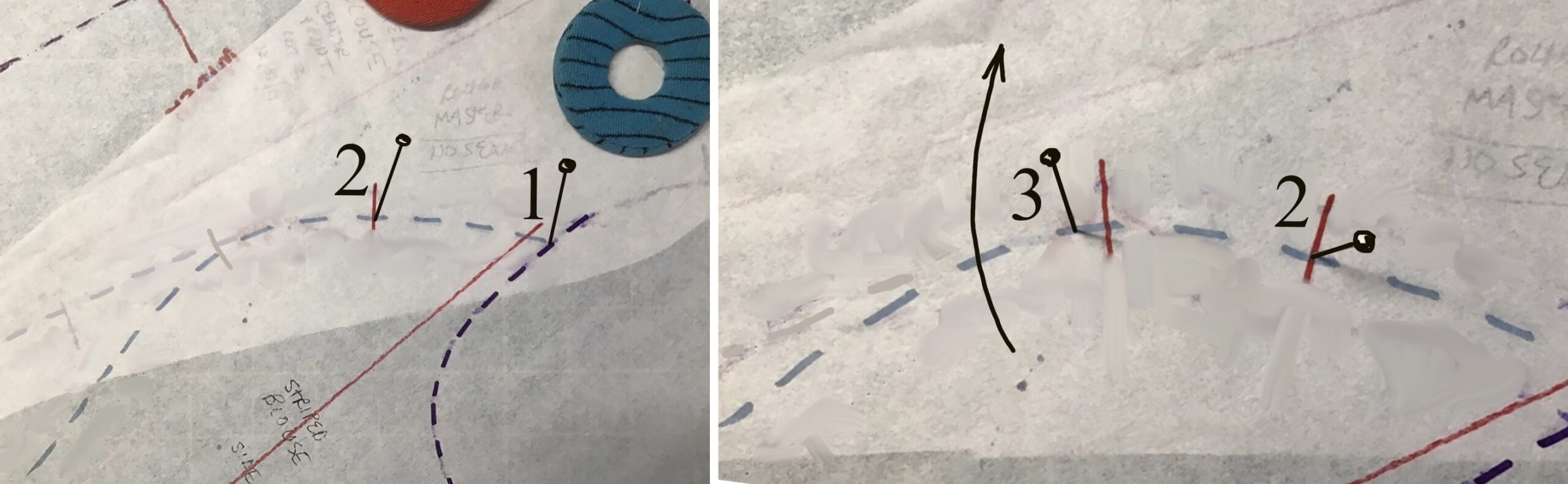 Align the starting points of the seams at the armscye and pin through (1). Overlay the seams as far as possible and put in a second pin (2). Take out the first pin and pivot until the next section aligns, then put a pin there (3). Keep leapfrogging your pins along the sewing line until you get to the bottom.
