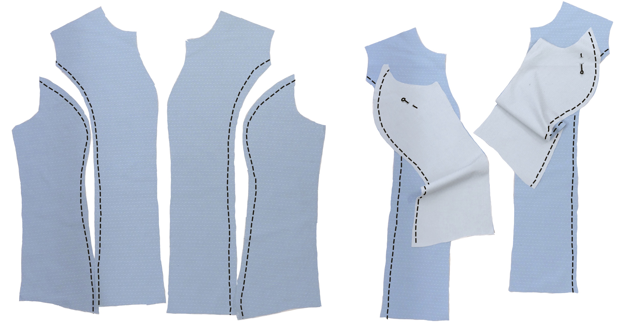 Here are the front and side front pieces, with only the sewing lines that will join them shown. Lay each set right-sides together, and hold together with a pin towards the edges that will be sewn (don’t try to line them up more yet).