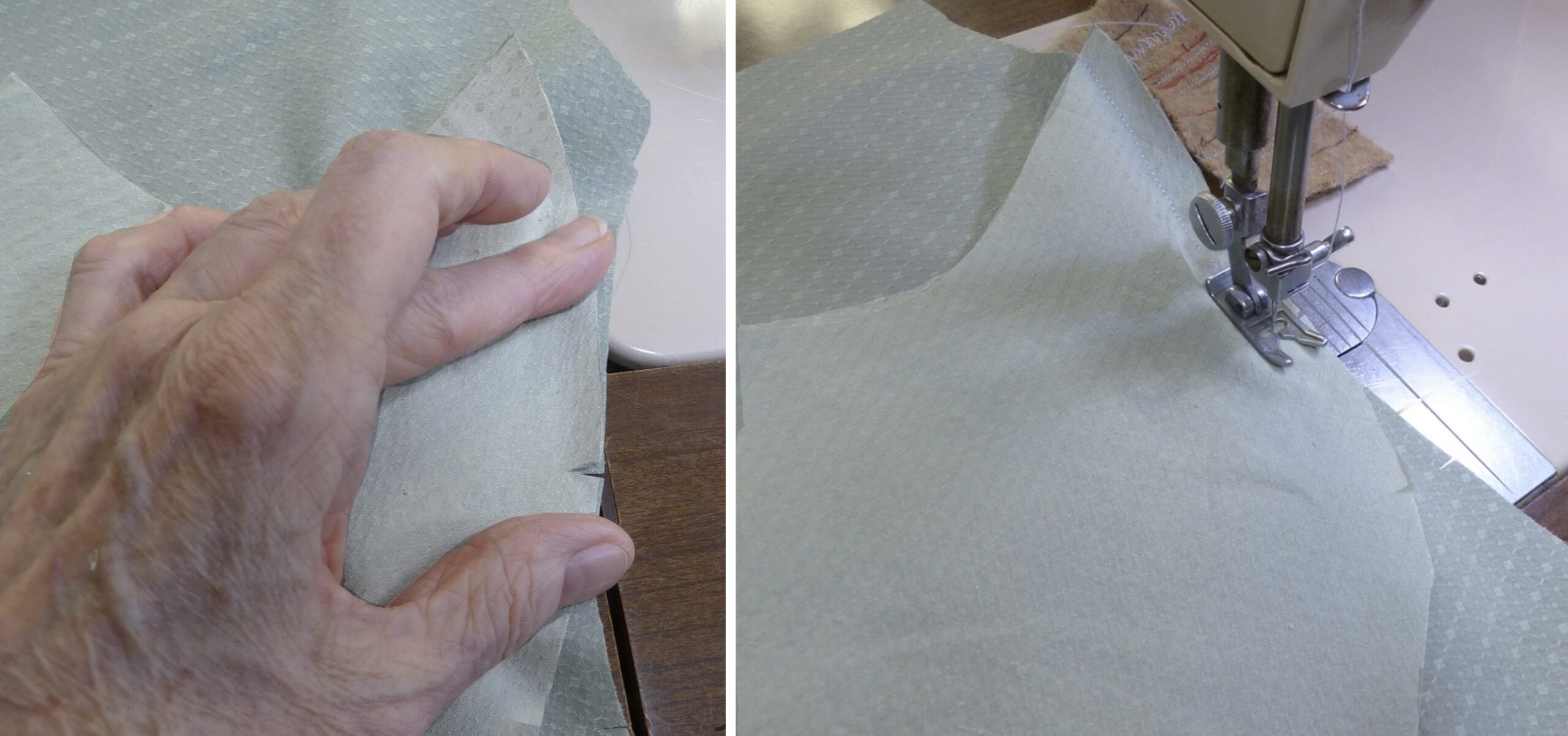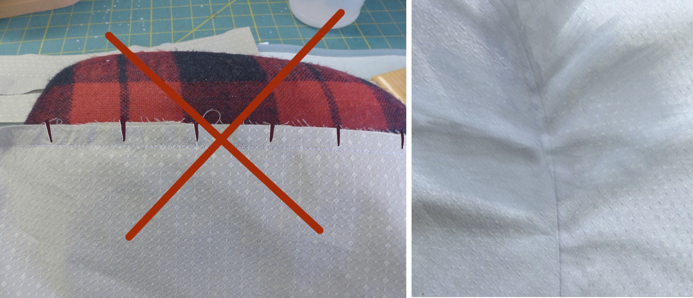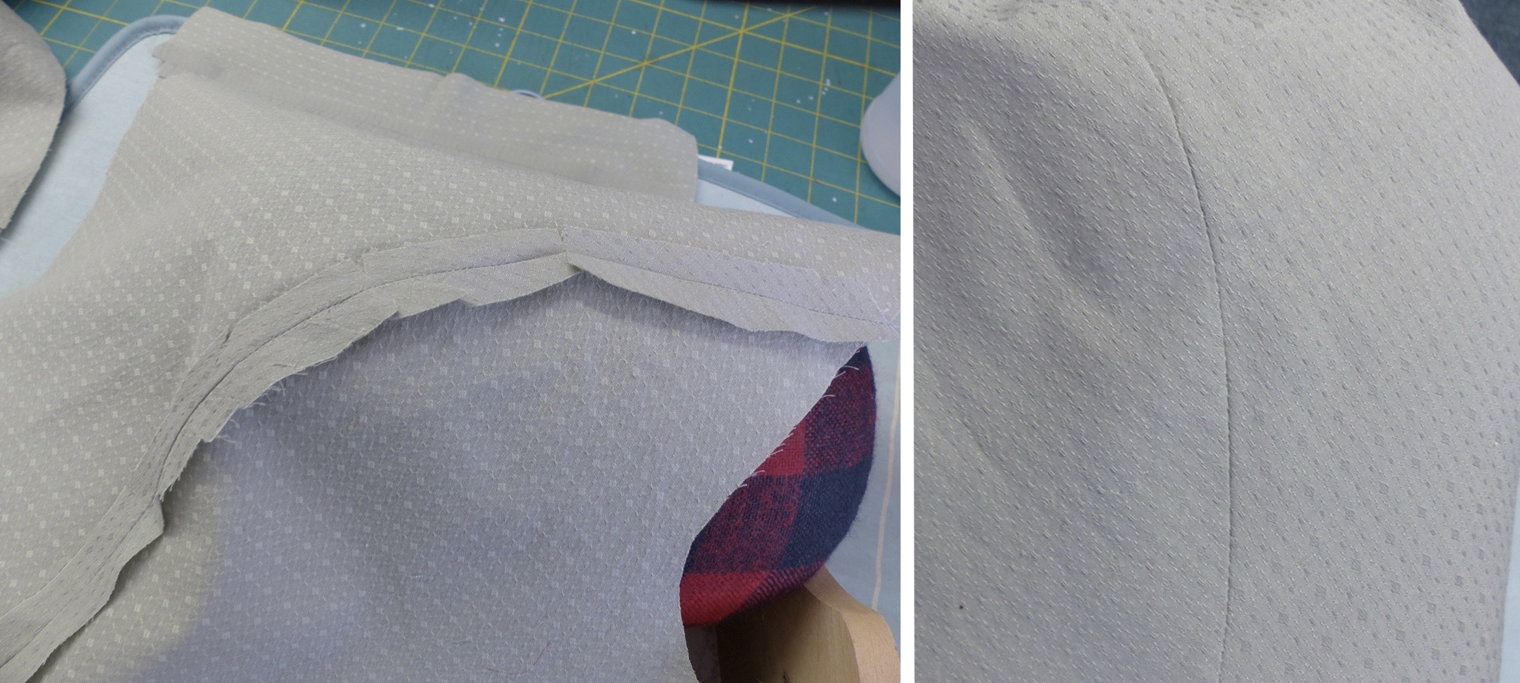Beginning at the armscye, match the top nips and then gently track the pieces together up to the start of the seam. Sew as far as the nips and stop with the needle down. Lift the presser foot if necessary and align the next section. Sew in short controlled bursts – don’t try to chew through, adjusting as you go.