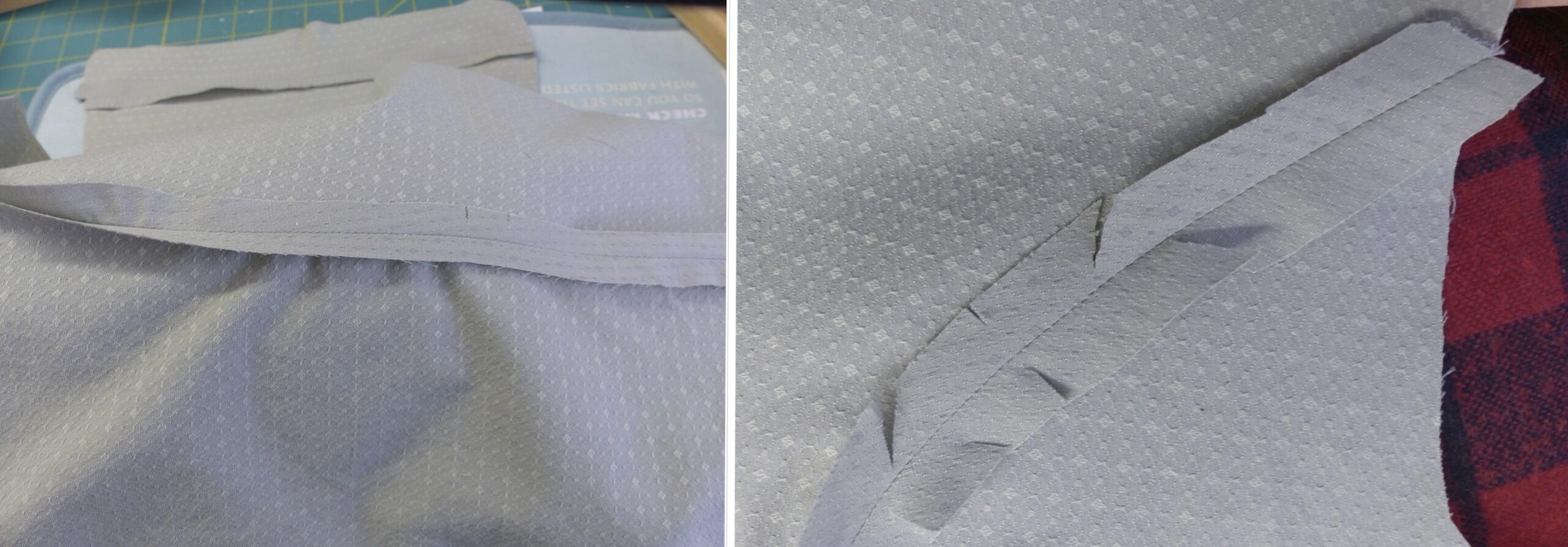 Instead, start to open the seam, pressing it with the point of your iron. Wherever you see the fabric under tension, make a diagonal cut only as deep as necessary to release it. The cuts are rarely symmetrical. Put them where they need to go (the sets of straight cuts were the nips to align the sides).