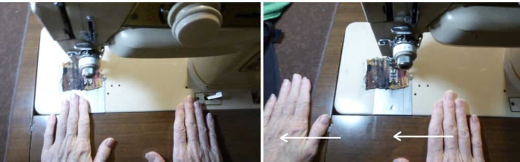 Raise the bed of the machine until your forearms make a right angle at your elbow. Use a kitchen anti-slip mesh or a rubber pad (whatever you pin into for blocking would work) to keep the machine’s vibration from walking it off into the bush. Putting other weight on the table – books? canned goods? – also helps.