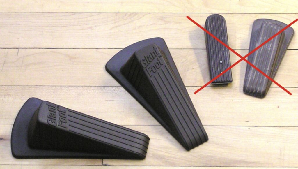 Whopping big door stoppers give you this angle. If you only buy a pair of these to start upgrading, you’ll be astonished at how much difference they make. The puny little ordinary ones aren’t big enough.