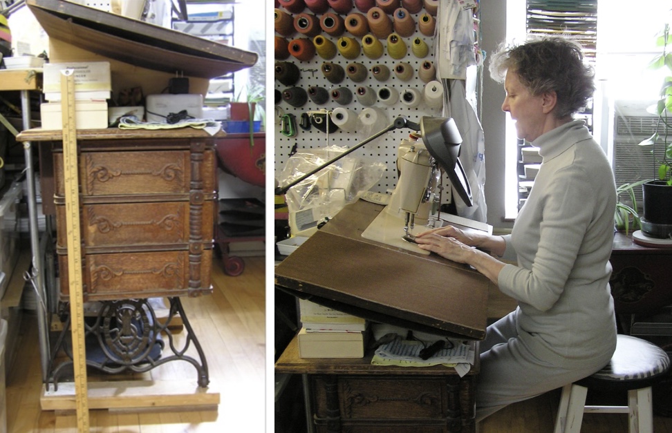 Courtney Willis (spouse of Connie) did most of the work to modify my treadle cabinet to my specs. Here’s how much we raised the bed. I am barely 5’. That’s the biggest magnifying lens/light I could afford (not turned on here).