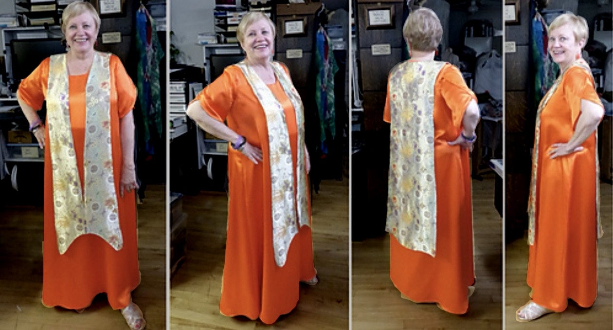 She was originally willing to pay me to do the embellishment, and jumped at the chance to do it herself. She found three kinds of gold thread, one of which was the wrapped-cord stuff, which neither of us liked*. Her “sampler” using chain stitch is at right, using thread of two strands of a thin mylar. It was slow work, but much faster and easier than the other options.