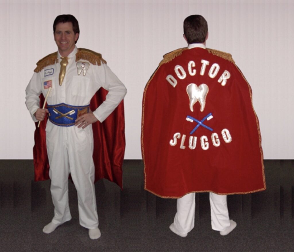 My Dentist, dressed for giving informative talks to school groups, scout troops, etc. He had a stripped-down version for running marathons (he handed off the cape). His college roommates christened him Doctor Sluggo during the Mister Bill SNL era.