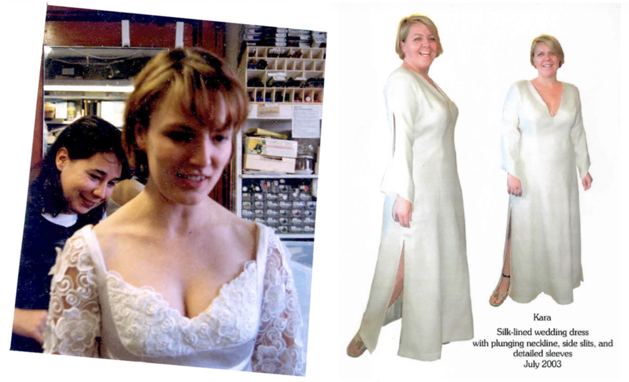 The wedding dress was done from the bride’s concept. An initial sketch of the knotwork is visible underneath at far right. My guess is that it was done with a light box on the doupioni with a fine point Pigma Micron.