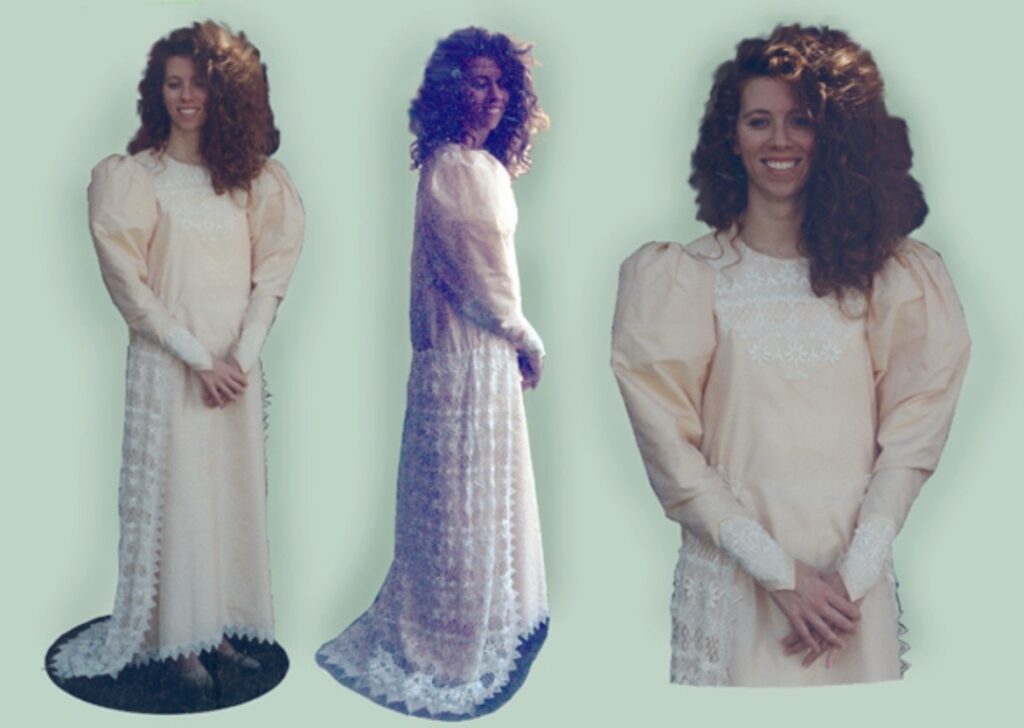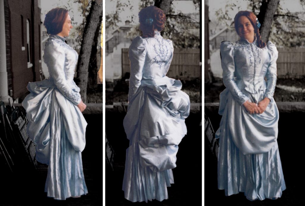 add and edit text: Mina Harker’s walking gown from Bram Stoker’s Dracula, hand embroidered, also corsetry, working covered buttons